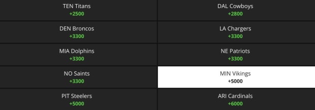 DraftKings have Kansas City (+500) and Tampa Bay (+650) as their top two favorites. After that, there is a gap between Buffalo (+1100) and the Los Angeles Rams (+1300). Baltimore and San Francisco are tied as fifth favorites with a +1400 moneyline price.